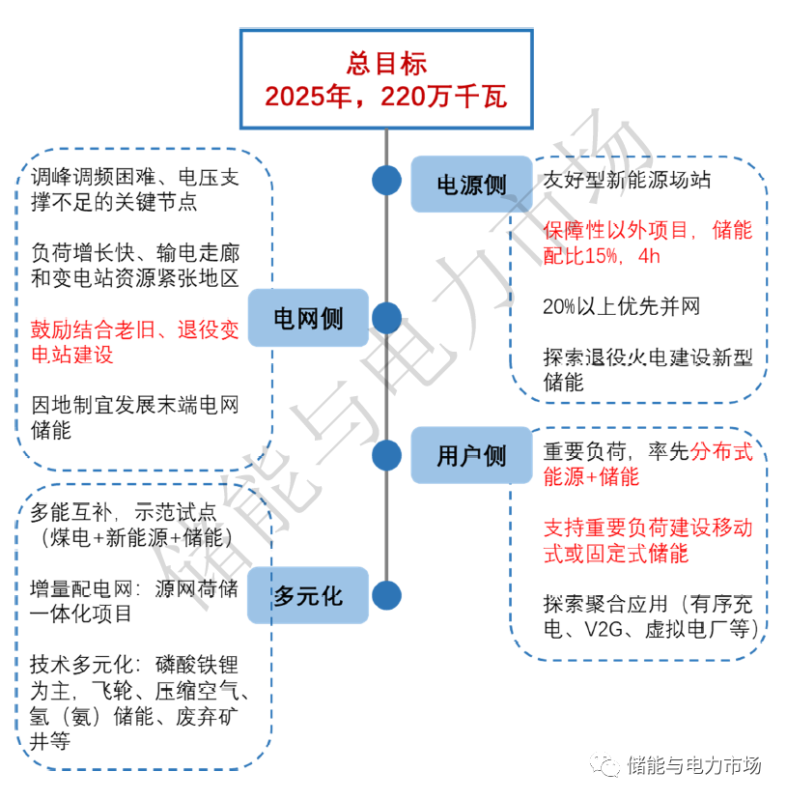 為實現(xiàn)此目標(biāo),電源側(cè)對非保障性新能源發(fā)電項目提出儲能配置要求,并推廣獨立共享儲能模式;電網(wǎng)側(cè)著重在關(guān)鍵電網(wǎng)節(jié)點布局儲能系統(tǒng),鼓勵結(jié)合老舊、退役變電站建設(shè)儲能試點項目;用戶側(cè)將率先推動分布式能源+儲能的應(yīng)用。