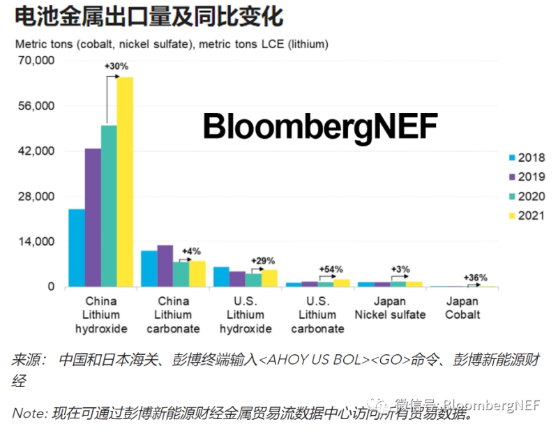 2021年鋰出口激增。中國氫氧化鋰出口同比增長30%,而碳酸鋰出口量同比增長4%,從2020年大幅下降41%中反彈。