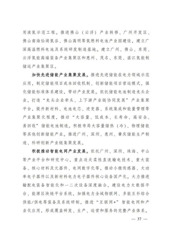 加快先進儲能產(chǎn)業(yè)集聚發(fā)展。推進先進儲能在電力領域示范應用,制定儲能項目成本回收機制、 創(chuàng)新儲能項目營運模式、 強化儲能標準體系建設,帶動產(chǎn)業(yè)發(fā)展。依托儲能電池制造龍頭企業(yè),打造 “龍頭企業(yè)牽頭、 上下游產(chǎn)業(yè)鏈協(xié)同發(fā)展” 產(chǎn)業(yè)集聚平臺,提升新材料、 電池電芯、 逆變器、 系統(tǒng)集成和能量管理等產(chǎn)業(yè)集聚化程度,推動 “ 大容量、 低成本、 長壽命、 高安全、 易回收” 儲能電池制造。積極布局大容量儲熱 (冷) 、 物理儲能等其他創(chuàng)新儲能產(chǎn)業(yè)。推進廣州、 深圳、 惠州、 肇慶儲能生產(chǎn)制 造、 科研創(chuàng)新產(chǎn)業(yè)鏈集聚發(fā)展。