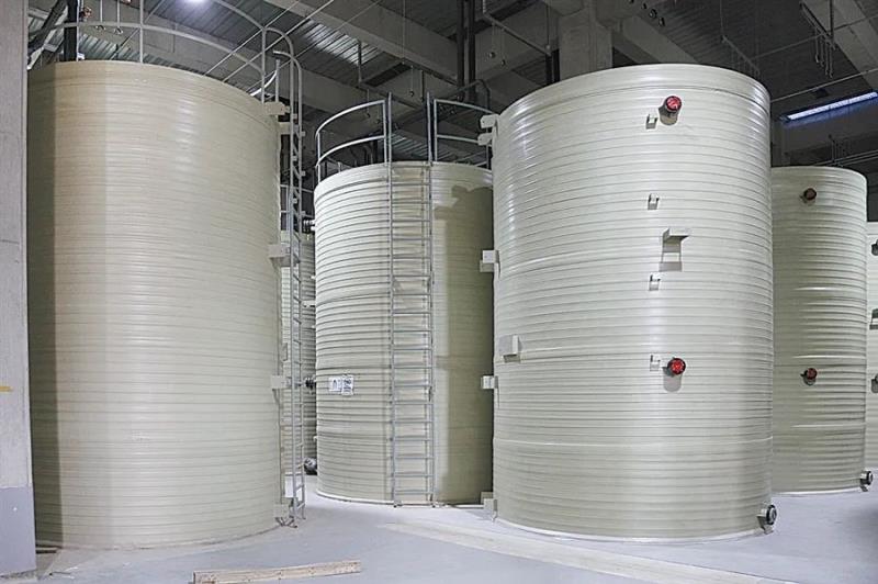 大連液流電池儲(chǔ)能調(diào)峰電站一層的電解液儲(chǔ)罐區(qū)。