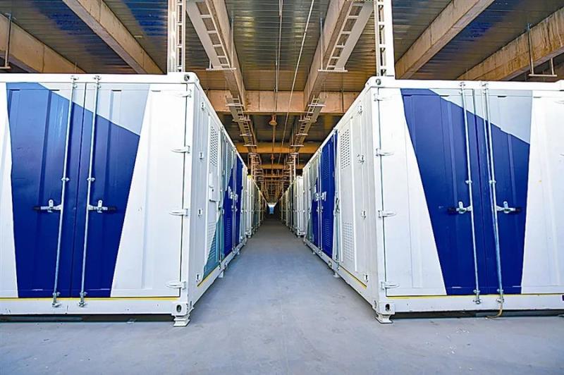 大連液流電池儲(chǔ)能調(diào)峰電站二層的電堆集裝箱區(qū)。