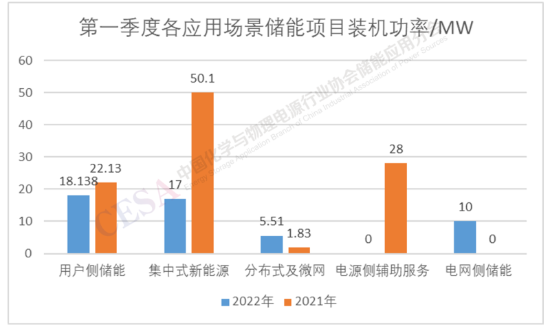 2021-2022兩年間第一季度集中式新能源和用戶側(cè)儲(chǔ)能均占較大比例,但2022年第一季度集中式新能源裝機(jī)功率較2021年相對(duì)減少。