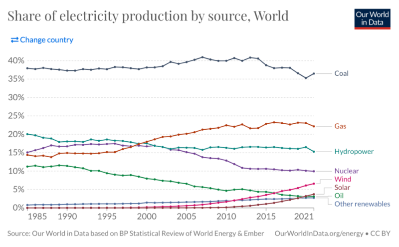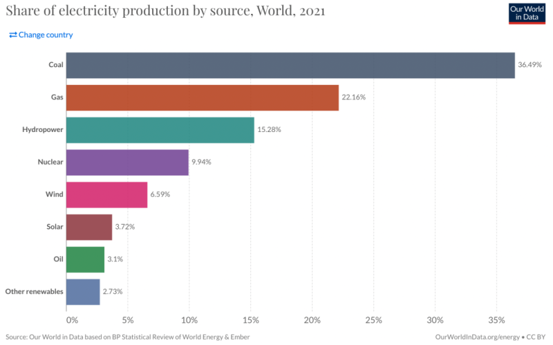 中國(guó)儲(chǔ)能網(wǎng)訊:據(jù)Our World in Data網(wǎng)站匯總數(shù)據(jù),2021年全球電力結(jié)構(gòu)(比例%)如下: