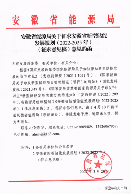 中國(guó)儲(chǔ)能網(wǎng)訊:近日,安徽省能源局發(fā)布《安徽省新型儲(chǔ)能發(fā)展規(guī)劃(2022-2025)》(征求意見(jiàn)稿)(以下簡(jiǎn)稱《規(guī)劃》)。依據(jù)《規(guī)劃》,到2025年安徽省將實(shí)現(xiàn)新型儲(chǔ)能裝機(jī)規(guī)模300萬(wàn)千瓦以上。