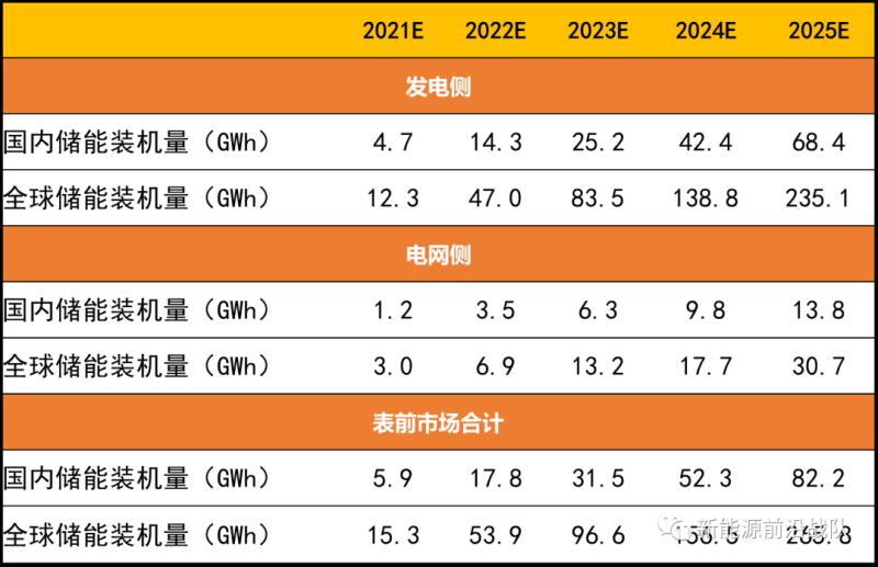 基于我們前文對國內(nèi)發(fā)電側、電網(wǎng)側儲能裝機量預測,以及此前我們對海外表前市場的裝機量預測,我們預計: