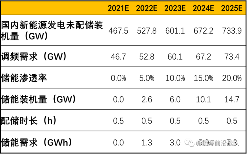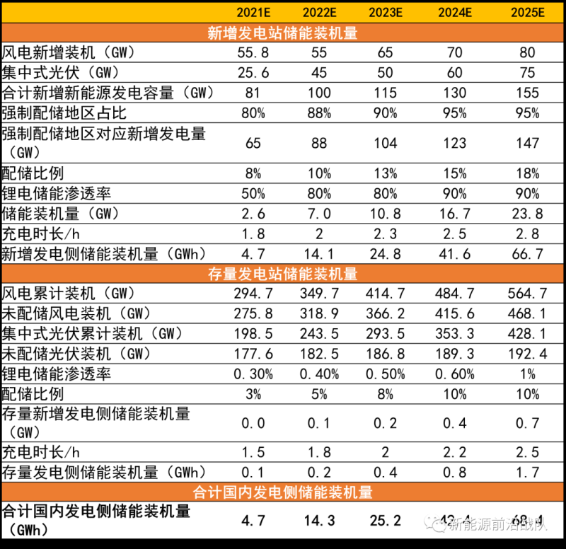 國內(nèi)新能源發(fā)電未配儲裝機量:基于20年未配儲新能源發(fā)電裝機量及21-25年新能源發(fā)電裝機量及發(fā)電側強配比例測算;