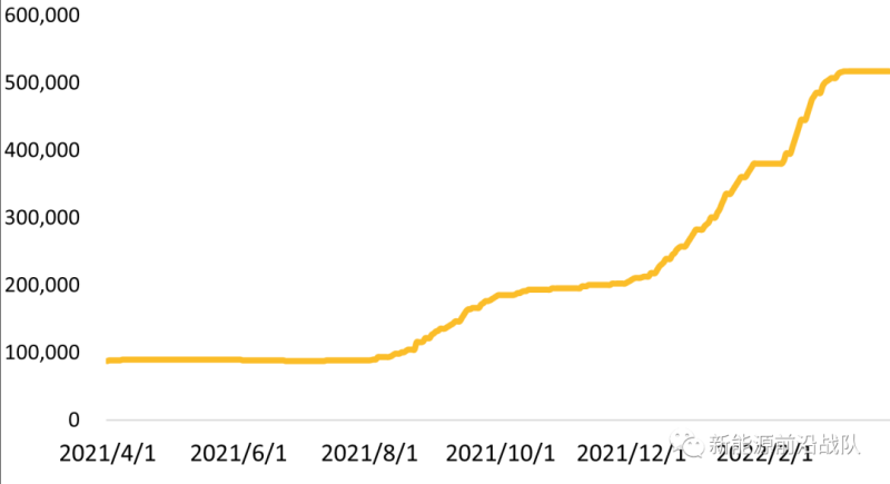 受動力電池需求爆發(fā)影響,電池級碳酸鋰因供需緊張價格不斷增長,由21年4月1日約8.7萬元/噸漲至22年3月50+萬元/噸。