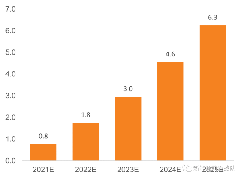 測算結果:基于調(diào)峰的儲能需求及考慮儲能年充放電時長,預計21-25年國內(nèi)調(diào)峰場景下儲能需求將為0.8/1.8/3.0/4.6/6.3GWh,4年CAGR+69%。