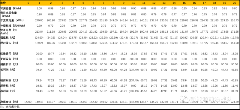 儲能項目:建設成本、循環(huán)壽命與前文假設相同;由于同時參與調(diào)峰+調(diào)頻需要更高頻的充放電,因此年衰減將達到3%,對應全生命周期縮小為8年;