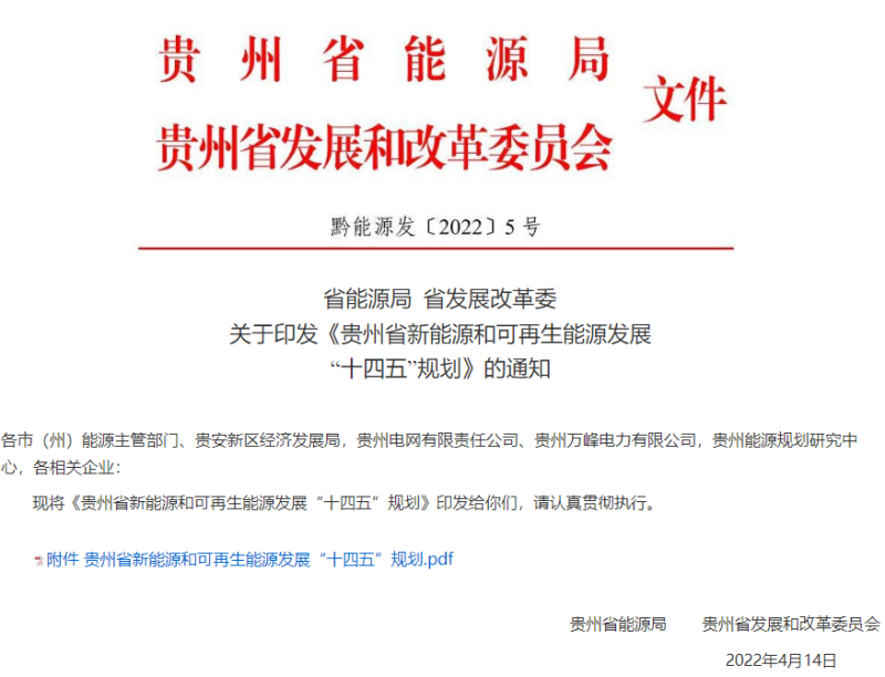 省能源局?省發(fā)展改革委關(guān)于印發(fā)《貴州省新能源和可再生能源發(fā)展 “十四五”規(guī)劃》的通知