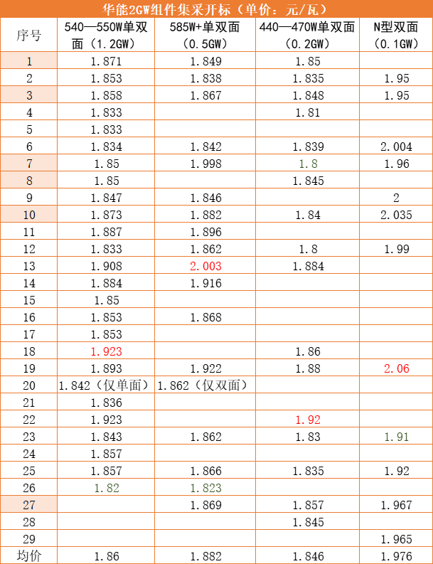 根據(jù)開標(biāo)結(jié)果來看,標(biāo)段一最低報(bào)價(jià)為1.82元/瓦,最高報(bào)價(jià)為1.923元/瓦,均由二線組件企業(yè)投出,整體均價(jià)為1.86元/瓦;標(biāo)段二整體均價(jià)為1.882元/瓦,高出標(biāo)段一約0.02元/瓦左右,最高報(bào)價(jià)已超出2元/瓦。標(biāo)段三整體報(bào)價(jià)最低,均價(jià)為1.846元/瓦,最低價(jià)格來到了1.8元/瓦,由頭部組件企業(yè)報(bào)出。標(biāo)段四由于為N型組件,整體報(bào)價(jià)最高,均價(jià)為1.976元/瓦,最低報(bào)價(jià)也達(dá)到了1.91元/瓦。