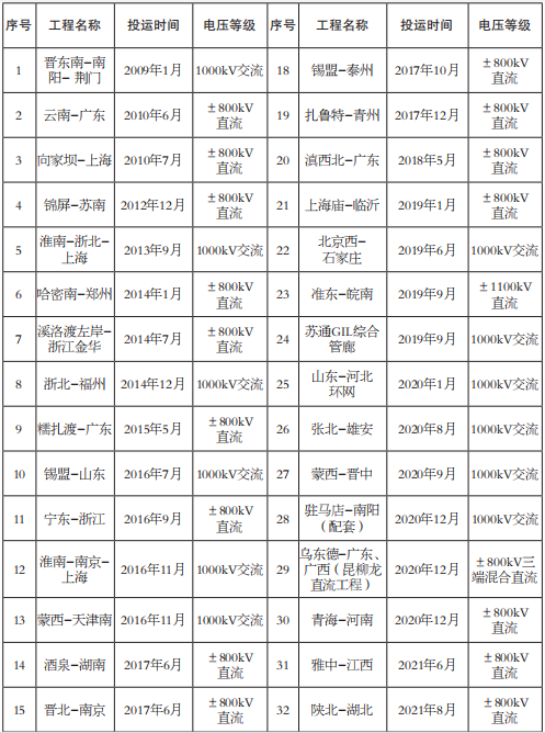 表6 我國已建成投運特高壓工程