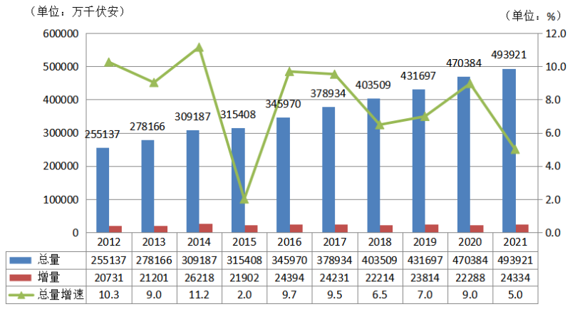 圖4 2012~2021年全國電力裝機及增速情況(單位:萬千瓦,%)