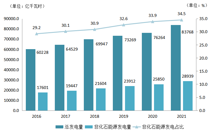 圖13 2016~2021年全國發(fā)電量及非化石能源發(fā)電占比情況