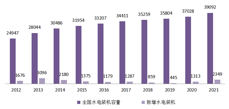 圖12 2012~2021年水電裝機和新增裝機情況(單位:萬千瓦)