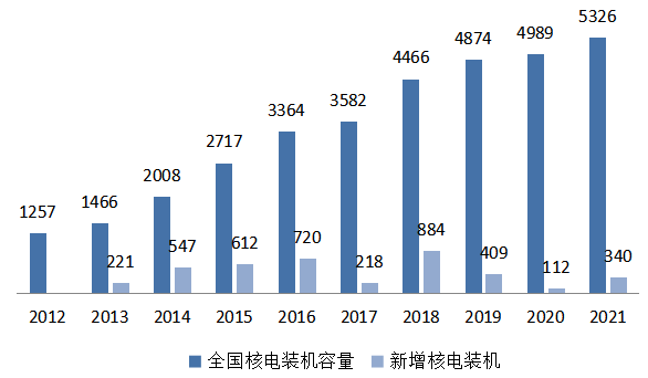 圖11 2012~2021年核電裝機和新增裝機情況(單位:萬千瓦)