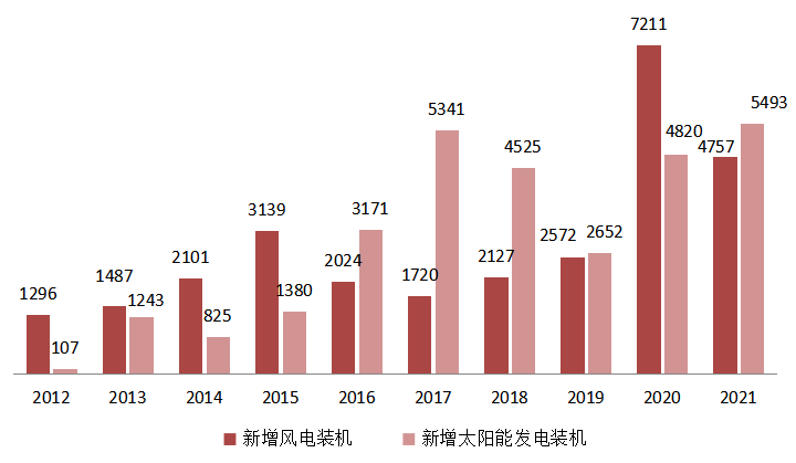 圖10 2012~2021年新增風電、太陽能發(fā)電裝機情況(單位:萬千瓦)