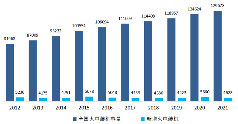 圖9 2012~2021年火電裝機和新增裝機情況(單位:萬千瓦)