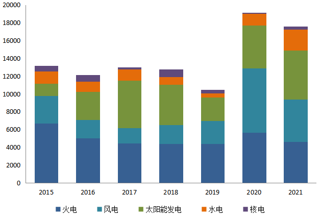圖8 2015~2021年全國新增電力裝機結構對比(單位:萬千瓦)