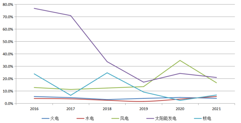 圖6 2016~2021年火電、水電、風電、太陽能發(fā)電、核電裝機增速情況