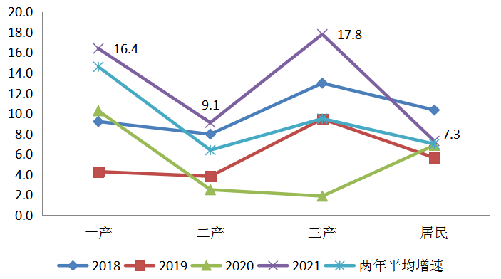從2021年的兩年平均增速來看,僅有一產(chǎn)用電增速高于2018、2019年水平,二產(chǎn)、三產(chǎn)及居民生活用電增速在2018和2019年間。