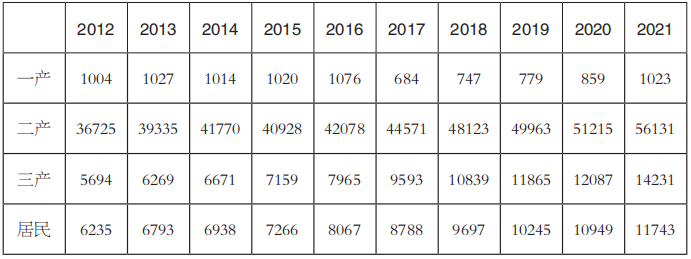 表1 2012~2021年分產(chǎn)業(yè)用電量(單位:億千瓦時)