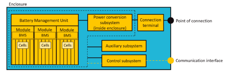 英國(guó)對(duì)電池儲(chǔ)能系統(tǒng)的安全要求可以 分為電氣安裝要求、電網(wǎng)連接要求、產(chǎn)品安全監(jiān)管要求、危險(xiǎn)品監(jiān)管要求。其產(chǎn)品安全涉及幾類(lèi)安全標(biāo)準(zhǔn),例如電能儲(chǔ)能系統(tǒng)、鋰離子電池、控制和電池管理系統(tǒng)、電力電子變流器系統(tǒng)和逆變器以及電磁兼容性(EMC)。