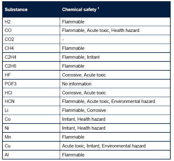 鋰離子電池中的電解質(zhì)由揮發(fā)性有機溶劑和鋰鹽組成,通常是六氟磷酸鋰(LiPF6)。有機溶劑在升高的溫度下蒸發(fā),并作為易燃氣體釋放。電池排放氣體的體積和成分取決于許多因素,例如電池成分、荷電狀態(tài)(SOC)和排放原因。其排放氣體可能包括揮發(fā)性有機化合物(如碳酸烷基酯、甲烷、乙烯和乙烷)、氫氣、一氧化碳、二氧化碳、煙灰以及其他含有鎳、鈷、鋰、鋁、銅的金屬微粒。討論的一個重點是排放氣體中的氟化氫和其他氟化物的含量,因為它們具有毒性。氟化氫具有高反應(yīng)性并具有腐蝕性,可導(dǎo)致人體嚴重燒傷。對于整個電池組,由于有塑料外殼等其他組件,在電池火災(zāi)的氣體中發(fā)現(xiàn)氯化氫和氰化氫的有毒氣體。表5列出了在電池排放氣體中發(fā)現(xiàn)的成分,包括有無起火以及電池組火災(zāi)(包括外殼和其他組件)。