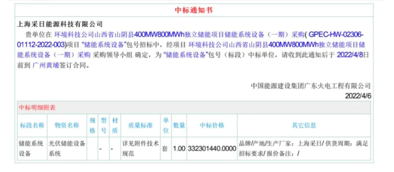4月6日,上海采日能源科技有限公司喜獲“儲(chǔ)能系統(tǒng)設(shè)備”包號(hào)(標(biāo)段)《中標(biāo)通知書(shū)》。