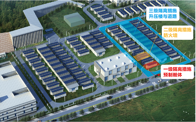 平高集團(tuán)建設(shè)的南京江北儲(chǔ)能電站從事前預(yù)警、事中處置和事后隔離三個(gè)維度,構(gòu)建了漸進(jìn)式三級(jí)安全防護(hù)體系。第一級(jí)為實(shí)時(shí)監(jiān)控電池狀態(tài),利用電池管理系統(tǒng)(BMS)、能量管理系統(tǒng)(EMS),實(shí)現(xiàn)提前預(yù)警;第二級(jí)為構(gòu)建立體式滅火系統(tǒng),艙內(nèi)設(shè)置消防風(fēng)機(jī)、可燃?xì)怏w探測(cè)器、感溫感煙消防報(bào)警系統(tǒng)、七氟丙烷氣體滅火系統(tǒng)、高壓細(xì)水霧滅火系統(tǒng)等多種滅火系統(tǒng);第三級(jí)為合理設(shè)置防火分區(qū),即利用帶防火巖棉夾層的預(yù)制艙體實(shí)現(xiàn)電池艙物理隔離的一級(jí)隔離措施,利用防火墻實(shí)現(xiàn)防火小單元分區(qū)的二級(jí)隔離措施及利用站區(qū)耐火建筑及道路實(shí)現(xiàn)防火大單元分區(qū)的三級(jí)隔離措施,將儲(chǔ)能電站安全風(fēng)險(xiǎn)控制在最小。并輔以電站級(jí)消防給水系統(tǒng)、排煙系統(tǒng)等多層級(jí)的消防設(shè)施。具有類似配置的昆山儲(chǔ)能電站拿到了國(guó)內(nèi)第一張難得的“消防”綠卡。