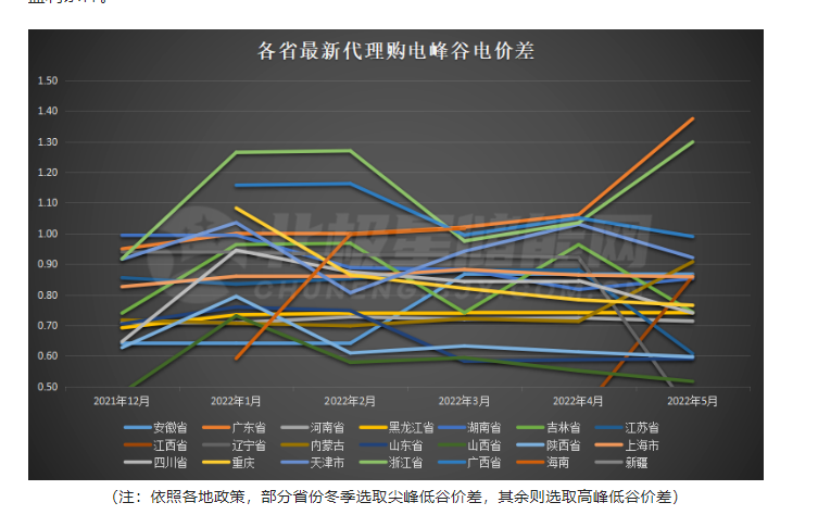 各地政策中提出尖峰電價(jià)受季節(jié)性尖峰電價(jià)影響,以廣東為例,在7月、8 月和 9 月三個(gè)整月執(zhí)行尖峰電價(jià),另外只要日最高氣溫達(dá)到 35℃及以上,每天 11-12 時(shí)、15-17 時(shí)三個(gè)小時(shí)也執(zhí)行尖峰電價(jià)。蒙西地區(qū)則依照大小風(fēng)季具體情況,執(zhí)行上下浮動的峰谷電價(jià)。因而從2月開始,部分省市開始縮小峰谷電價(jià)差,但預(yù)計(jì)隨著夏季來臨,后續(xù)各省峰谷電價(jià)差又將進(jìn)一步拉大。