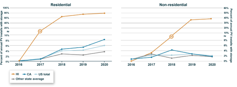 住宅太陽能發(fā)電設(shè)施配套部署儲能系統(tǒng)的比例一直在穩(wěn)步增長,但仍占市場的一小部分,占2020年安裝的美國住宅太陽能發(fā)電設(shè)施系統(tǒng)的6%(如圖11所示)。而在非住宅市場,2020年安裝的太陽能發(fā)電設(shè)施系統(tǒng)中只有2%配套部署儲能系統(tǒng),因?yàn)檫@些客戶更有可能獨(dú)立部署電池儲能系統(tǒng)。在住宅和非住宅市場中,夏威夷州因其凈計量改革而獨(dú)樹一幟,激勵更多的太陽能發(fā)電設(shè)施配套部署儲能系統(tǒng)。加利福尼亞州的住宅客戶可能會通過為防止森林火災(zāi)風(fēng)險而實(shí)施的斷電以及該州政府的激勵措施來增加電池儲能系統(tǒng)的部署。