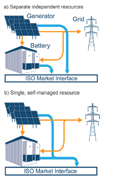 混合部署項(xiàng)目可以作為單一的、完全集成的資源或單獨(dú)但位于同一地點(diǎn)的資源與批發(fā)電力市場交互。作為一種綜合資源,混合項(xiàng)目運(yùn)營商在開發(fā)市場投標(biāo)時必須預(yù)測風(fēng)力發(fā)電量或太陽能發(fā)電量,并管理其配套的電池儲能系統(tǒng)。作為單獨(dú)的資源進(jìn)行管理,批發(fā)市場運(yùn)營商將實(shí)施方法來管理電池儲能系統(tǒng)的調(diào)度和風(fēng)力發(fā)或太陽能發(fā)電的可變性,同時考慮任何耦合約束。