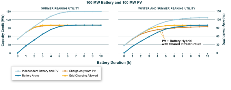圖8.不同持續(xù)時間的電池儲能系統(tǒng)、太陽能發(fā)電設(shè)施和混合部署項(xiàng)目之間的容量信用比較