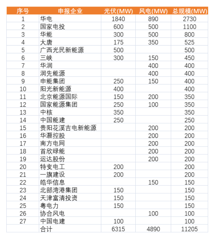根據(jù)光伏們查詢申報(bào)項(xiàng)目的業(yè)主發(fā)現(xiàn),華電以總規(guī)模2.73GW遙遙領(lǐng)先,位居榜首。其中光伏1.84GW、風(fēng)電890MW。其次是國(guó)家電投總規(guī)模1100MW,其中光伏600MW、風(fēng)電500MW。華能總計(jì)800MW,大唐525MW,廣西光民新能源500MW排在前五。除此之外三峽、陽(yáng)光新能源、中國(guó)能建、中國(guó)電建、華潤(rùn)、特變電工、南方電網(wǎng)等企業(yè)也在其中。具體規(guī)模與排名見下: