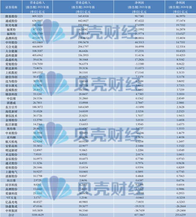 Wind統(tǒng)計(jì),申萬光伏設(shè)備行業(yè)的46家上市企業(yè)共實(shí)現(xiàn)營收5100.5億元,同比2020年增長44.7%;實(shí)現(xiàn)凈利潤417.3億元,同比增長63.3%。2020年,這46家企業(yè)的營收和凈利潤對(duì)應(yīng)分別是3524.6億元和255.6億元。