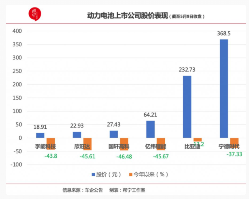 此外,從股價(jià)表現(xiàn)看,鋰電板塊已經(jīng)回調(diào)了一段時(shí)間。年初以來,Wind 鋰電池指數(shù)跌幅近 34%;個(gè)股方面,6 家動(dòng)力電池上市公司 " 全軍覆沒 ",股價(jià)與年初相比均為下跌走勢(shì),孚能科技、欣旺達(dá)、國(guó)軒高科、億緯鋰能接近 " 腰斬 ",寧德時(shí)代跌幅也超 30%。