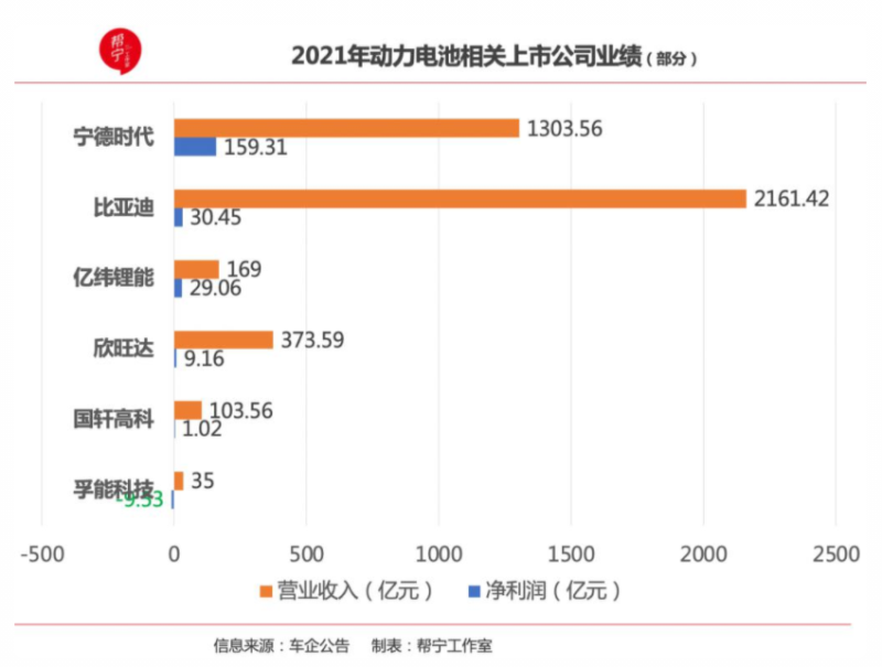 幫寧工作室統(tǒng)計(jì)了 6 家動(dòng)力電池相關(guān)上市公司的財(cái)報(bào)發(fā)現(xiàn),2021 年它們?nèi)繉?shí)現(xiàn)營(yíng)收增長(zhǎng),其中有 3 家營(yíng)收翻倍,孚能科技營(yíng)收增速達(dá) 2 倍以上,比亞迪和寧德時(shí)代破千億。