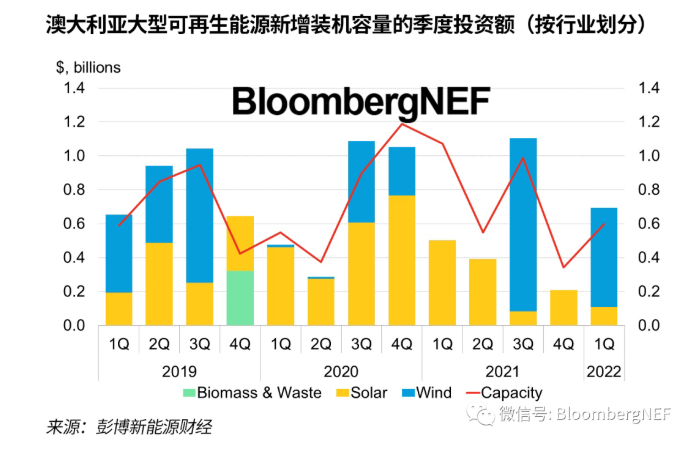 彭博新能源財經(jīng)估計,2022年第一季度,澳大利亞大型可再生能源新增裝機(jī)容量獲得投資6.94億美元(9.5億澳元)——繼2021年第四季度微弱增長后,該季度環(huán)比增幅達(dá)到233%,且在2021年第一季度基礎(chǔ)上同比增長38%。據(jù)估計,屋頂光伏等小型分布式裝機(jī)容量獲得投資8.05億美元。