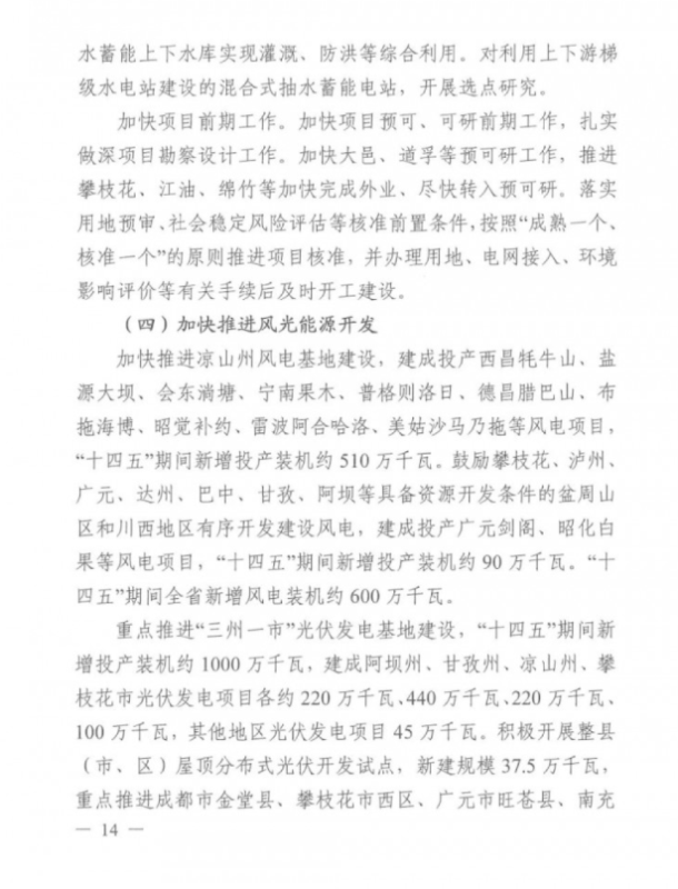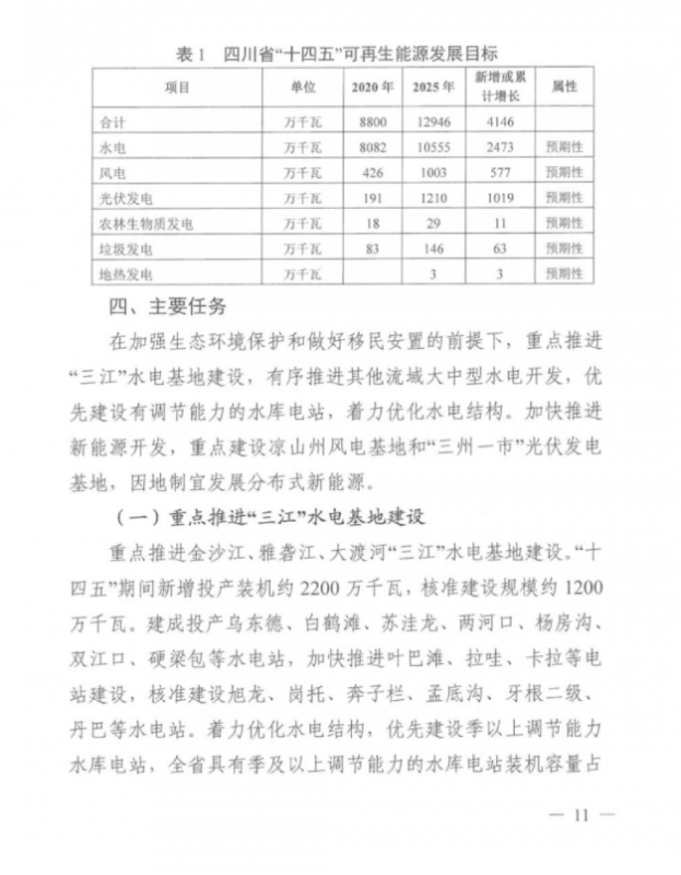 規(guī)劃指出,“十四五”期間四川省將新增水電裝機(jī)約2400萬(wàn)千瓦、風(fēng)電約600萬(wàn)千瓦、光伏發(fā)電約1000萬(wàn)千瓦。重點(diǎn)推進(jìn)“三江”(金沙江、雅礱江、大渡河)水電基地、涼山州風(fēng)電基地、“三州一市”(阿壩州、甘孜州、涼山州、攀枝花市)光伏發(fā)電基地建設(shè)。