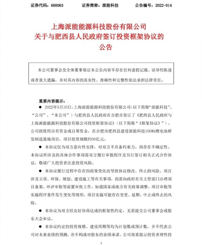 5月10日,派能科技與肥西縣人民政府在合肥市簽訂框架協(xié)議,公司擬使用自有資金或自籌資金,在肥西縣建設(shè)10GWh鋰電池研發(fā)制造基地項(xiàng)目,投資規(guī)模約50億元。