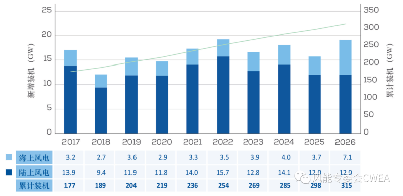 整體而言,2022―2026年歐洲年度新增風電裝機容量將呈上升之勢。未來五年歐洲陸上風電新增裝機容量將在全部風電新增裝機容量中占76%,并在2022年達到年度新增裝機容量的峰值——18.3GW,此后會略有下降,2023―2026年的年均新增裝機容量預計為17.3GW。