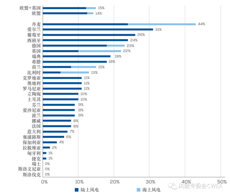 圖7 2021年歐洲各國風電所滿足的全社會電力需求比重