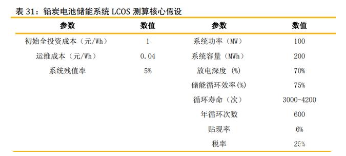 鉛炭電池儲能全壽命儲能度電成本(LCOS)測算核心假設(shè): 1)初始投資成本:鉛炭電池儲能系統(tǒng)中電芯成本較低,假設(shè)初始全投資成本為 1 元 /Wh。 2)年度運(yùn)維成本假設(shè):每年需要4%左右,為0.04元/W。 3)放電深度:鉛炭電池放電深度較低,為60-70%。 4)壽命:可循環(huán)2000次以上,多家企業(yè)表示,其鉛炭電池可在70%放電深度條件下 達(dá)到4200次的循環(huán)壽命。 4)循環(huán)效率:綜合多種文獻(xiàn),鉛炭電池循環(huán)次數(shù)可以達(dá)到70-85%,這里暫定75%, 部分可達(dá)80%以上。 5)貼現(xiàn)率:考慮到當(dāng)前央企能源企業(yè)的融資成本在4-5%,我們選取6%作為折現(xiàn)率。