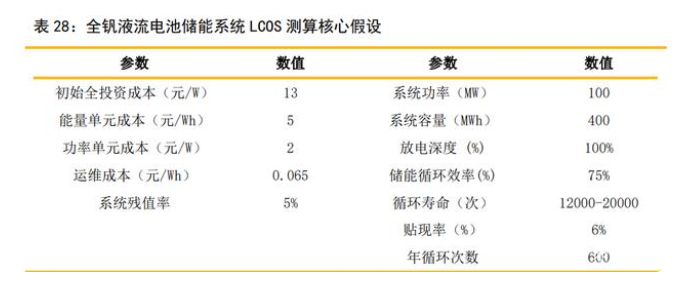 全釩液流電池儲能全壽命儲能度電成本(LCOS)測算核心假設(shè):