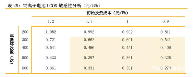 由于產(chǎn)業(yè)尚未應(yīng)用,我們假設(shè)在相對成熟階段,在初始投資成本1.1元/Wh,年均循 環(huán)次數(shù)300次,壽命為10年, LOCS為0.661元/kWh,與磷酸鐵鋰電池相當(dāng)。