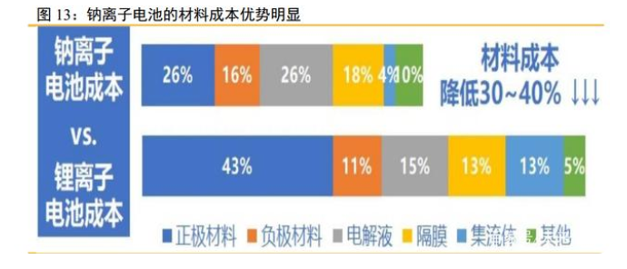 相關(guān)研究表明,綜合正極材料、負(fù)極材料和集流體幾個(gè)方面,鈉離子電池材料成本 約370元/kWh,而且隨著產(chǎn)業(yè)鏈成熟,材料成本有望進(jìn)一步下探,結(jié)合結(jié)構(gòu)件好電氣件成 本,初始容量投資有望控制在500-700元/kWh;性能方面,隨著研發(fā)持續(xù)投入和技術(shù)迭代, 電池循環(huán)壽命有望突破8000次以上。
