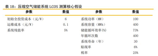壓縮空氣儲能全壽命儲能度電成本(LCOS)測算核心假設(shè): 1)初始投資成本:綜合多種文獻(xiàn),壓縮空氣初始投資成本在 6-7.5 元/瓦之間, 100MW 級別的成本預(yù)計(jì)可以達(dá)到 6000 元/kW 以下。我們假設(shè) 100MW/400MWh 的項(xiàng)目單位投 資成本為 6 元/W。 2)年度運(yùn)維成本假設(shè):壓縮空氣儲能所需的維修保養(yǎng)成本相對較高,每年需要2%左 右。我們假設(shè)運(yùn)維成本為0.1元/W。 3)系統(tǒng)壽命假設(shè):壓縮空氣產(chǎn)能電站的主體設(shè)施可以使用30-50年,我們這里保守 預(yù)測30年的運(yùn)營壽命。 4)循環(huán)效率:壓縮空氣儲能系統(tǒng)的能量利用效率近年來快速上升,大容量電站效率 已經(jīng)可以達(dá)到70%,先進(jìn)儲能項(xiàng)目可以達(dá)到75%。5)循環(huán)次數(shù):電站一般可以每天全容量沖放1-2次,對應(yīng)年循環(huán)次數(shù)350-700次,循 環(huán)次數(shù)越高,系統(tǒng)度電成本越低。 6)貼現(xiàn)率:考慮到當(dāng)前央企能源企業(yè)的融資成本在4-5%,我們選取6%作為折現(xiàn)率。