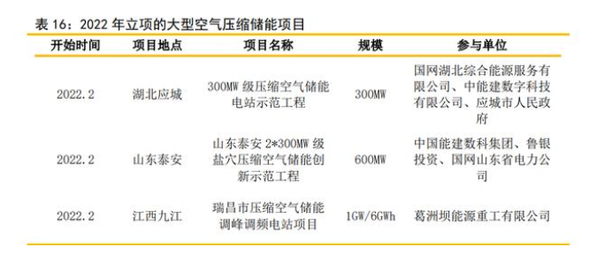 2022年以來大功率項(xiàng)目開始快速上馬。2022年2月,湖北應(yīng)城300MW(兆瓦)級壓縮 空氣儲能電站示范項(xiàng)目簽約活動;山東省泰安市推進(jìn)開發(fā)600MW(20MW)級鹽穴壓縮空氣 儲能電站;葛洲壩能源重工有限公司擬位于瑞昌市投資約80億元,建設(shè)規(guī)模為 1000MW/6000MWh的壓縮空氣項(xiàng)目。