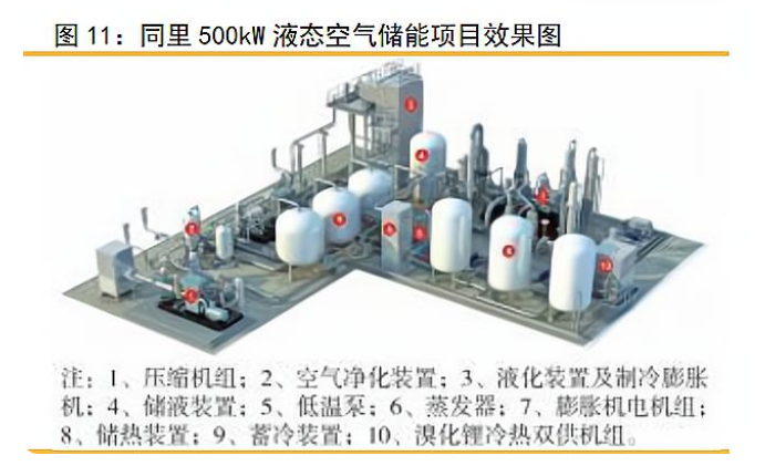 壓縮空氣系統(tǒng)構(gòu)成。壓縮空氣主要由壓縮系統(tǒng)、膨脹系統(tǒng)、發(fā)電及以及儲氣罐四大 核心部分。根據(jù)同里500kW液態(tài)空氣儲能項(xiàng)目效果圖,目前先進(jìn)的液態(tài)空氣儲能主要涉 及設(shè)備包括:1)壓縮機(jī)組,2)空氣凈化裝置,3)液化裝置及制冷膨脹機(jī),4)儲液裝置,5)低溫泵,6)膨脹劑電機(jī)組,7)膨脹機(jī)電機(jī)組,8)儲熱裝置,9)蓄冷裝置,10) 溴化鋰?yán)錈犭p供機(jī)組。